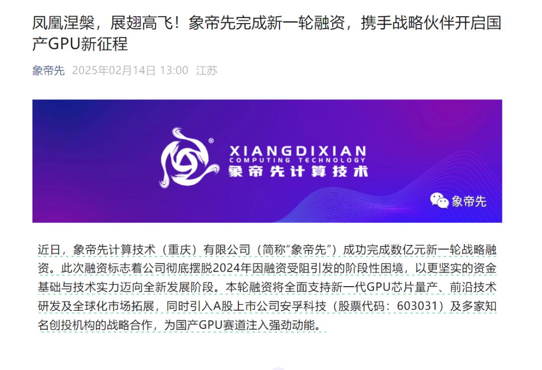 情人节这天,GPU独角兽象帝先正式揭开“白马王子”的神秘面纱,其 “救星”来自A股上市公司安孚科技及多家知名创投机构。