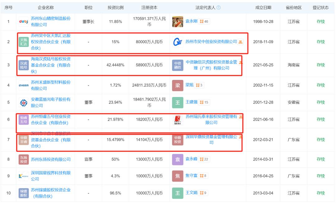 从多年前开始,袁永刚就已经入股不少基金当LP。天眼查信息显示,袁永刚如今担任22家公司股东,其中就有5家投资机构和私募基金,包括吴中创投、汉虎资本、瑞氏泰来投资、深圳华鼎和金海汇基金等。