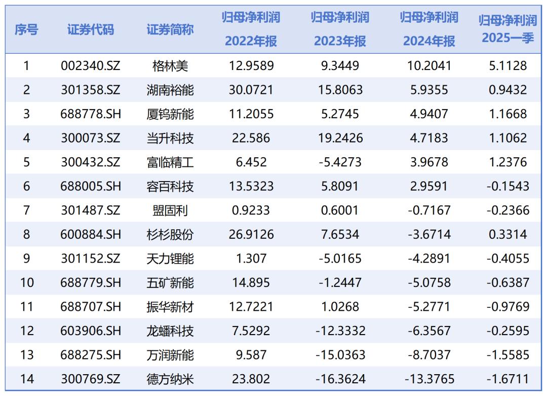 业绩表现也反映出这一趋势。截至5月7日,A股14家主要正极材料上市公司已全部披露2024年年报,其中8家出现归母净利润亏损,仅6家实现盈利。