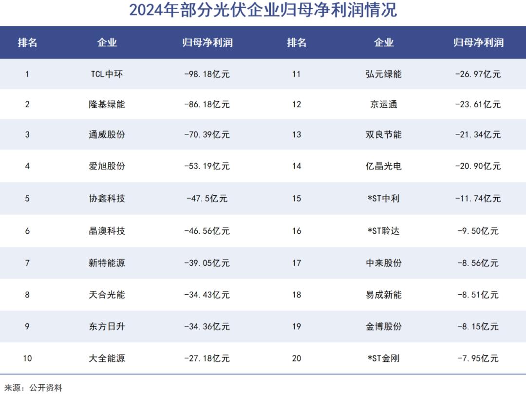 2024年光伏企业几乎全军覆没,全行业亏损超300亿元,而且规模越大亏损越严重。这一年TCL中环失血近百亿,隆基巨亏86亿元,通威70亿,爱旭、协鑫科技、晶澳损失都在50亿左右。
