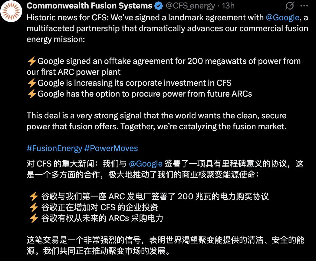 最新消息,科技巨头谷歌宣布向核聚变初创公司Commonwealth Fusion Systems(CFS)追加注资,并与该公司签署了一项购买电力的协议。