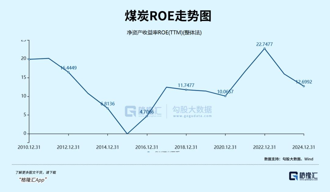 2016-2024年,煤炭行业ROE为4.7%、12.4%、11.7%、11.4%、10%、16.6%、22.7%、16%、12.7%。横向对比,其中,2022年煤炭ROE已经超过食品饮料的20.3%,成为31个申万行业中盈利能力最强的行业。