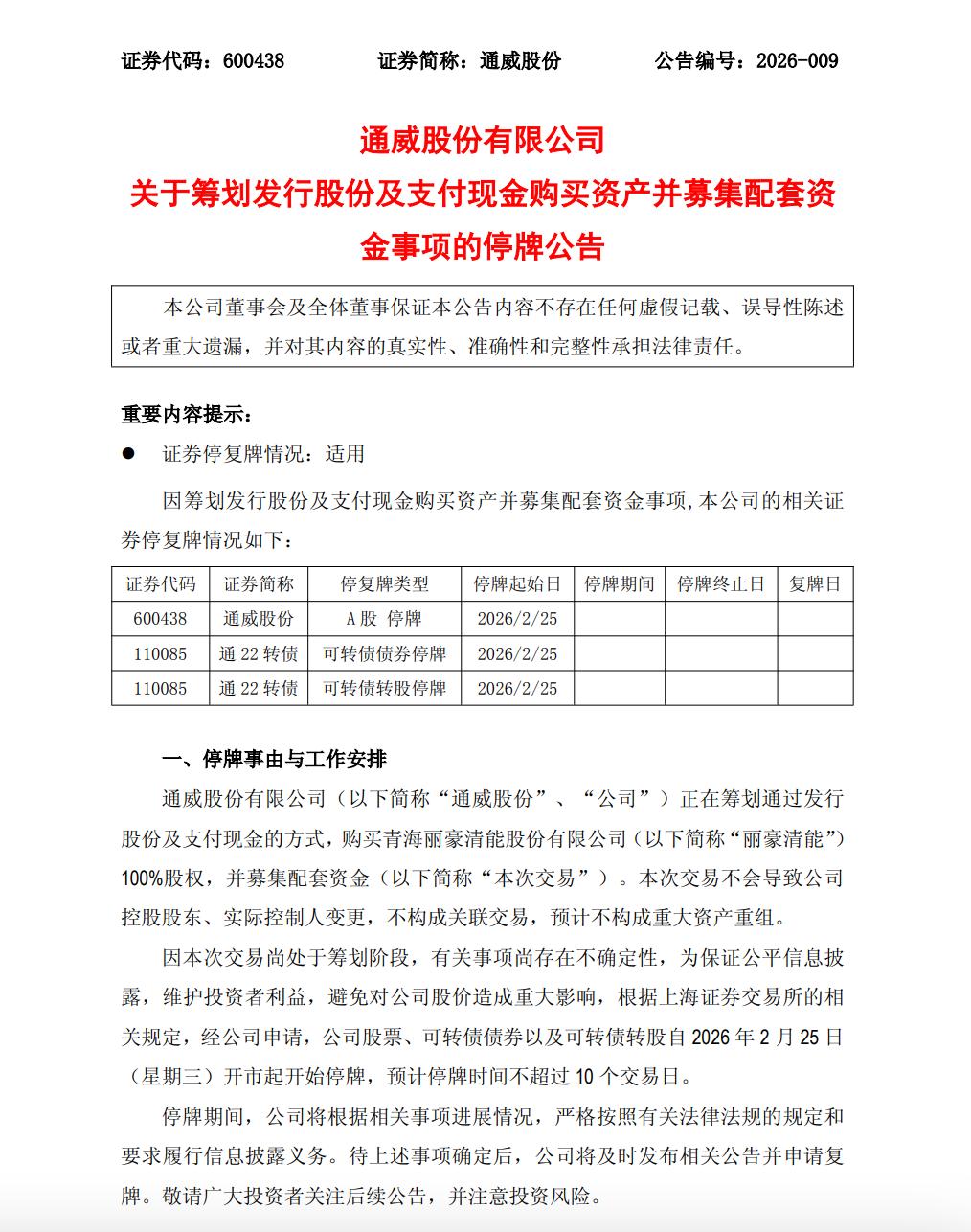 为保证公平信息披露,维护投资者利益,避免对公司股价造成重大影响,根据上海证券交易所的相关规定,通威股份股票、可转债债券以及可转债转股自2026年2月25日开市起开始停牌,预计停牌时间不超过10个交易日。