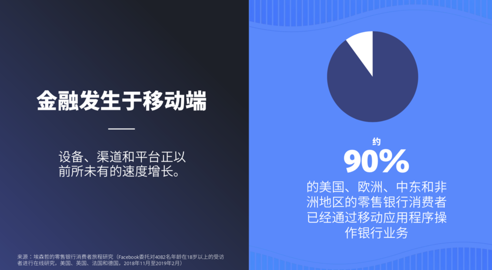 约90%的美国、欧洲、中东和⾮洲地区的零售银⾏消费者,已经通过移动应⽤程序操作银⾏业务;