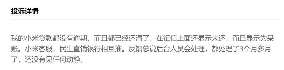 但6月15日,在征信乌龙闹出的一个月后,聚投诉仍有用户投诉称还清了小米金融的贷款且未逾期,但在民生银行的征信报告上还显示未还,且显示为呆账。联系客服反馈称后台人员会处理,但处理了3个多月还没有任何动静。