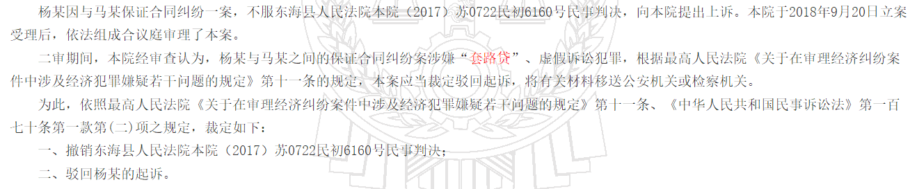 但是今年12月16日,江苏省连云港市中级人民法院经审查认为,杨某与马某宇的保证合同纠纷案涉嫌“套路贷”、虚假诉讼犯罪,根据最高人民法院《关于在审理经济纠纷案件中涉及经济犯罪嫌疑若干问题的规定》第十一条的规定,将有关材料移送公安机关或检察机关。