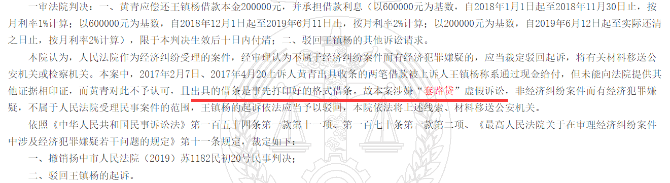 12月14日,镇江市人民法院撤销了扬中市人民法院(2019)苏1182民初20号民事判决,认为黄某与王某杨之间的纠纷,不属于经济纠纷案件而有经济犯罪嫌疑的,应当裁定驳回起诉,将有关材料移送公安机关或检察机关。其中一个理由是“出具的借条是事先打印好的格式借条”。