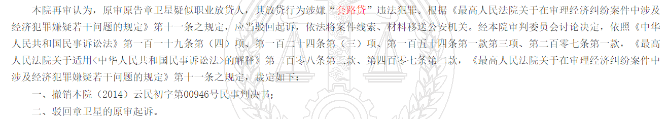 然而,2019年11月7日,徐州市云龙区人民法院对此案进行再审,认为章某星疑似职业放贷人,其放贷行为涉嫌“套路贷”违法犯罪,因此撤销当时做出的判决。