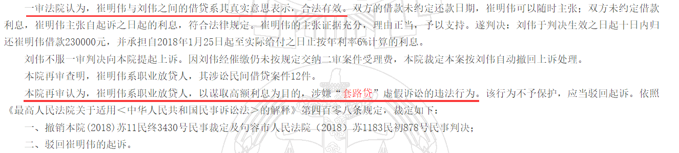 但是再审认为,崔某伟系职业放贷人,以谋取高额利息为目的,涉嫌“套路贷”虚假诉讼的违法行为。