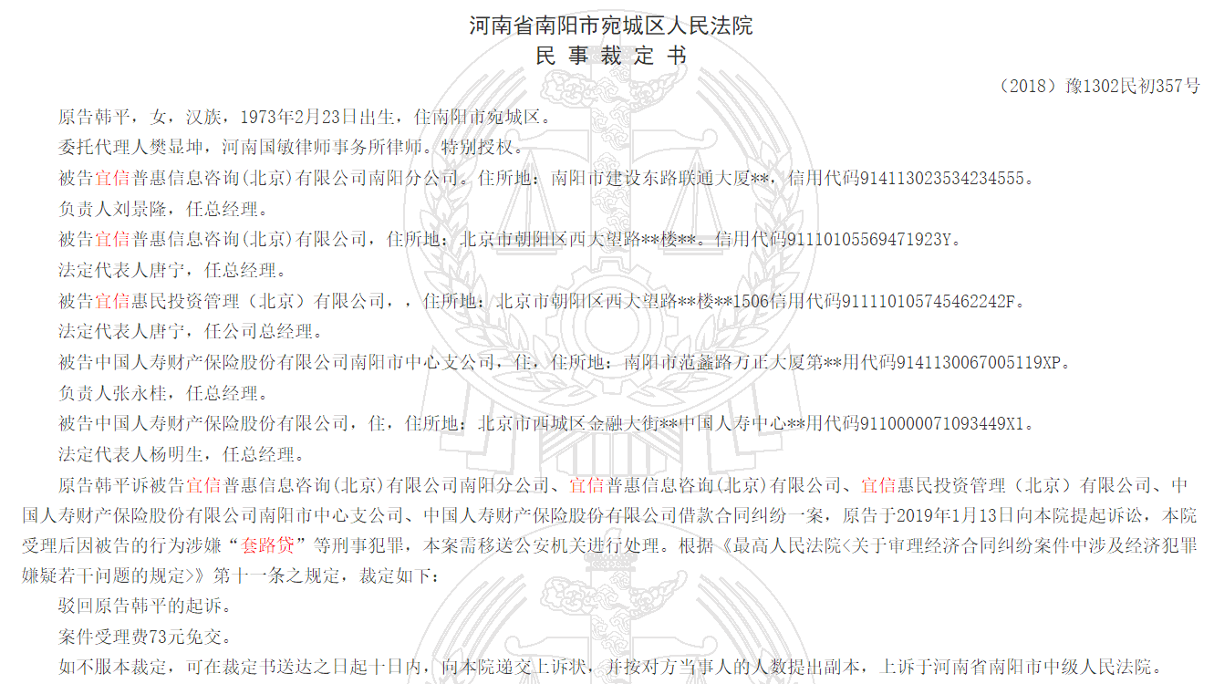 今年1月,在韩某起诉宜信普惠信息咨询(北京)有限公司南阳分公司、宜信普惠信息咨询(北京)有限公司、宜信惠民投资管理(北京)有限公司、中国人寿财产保险股份有限公司南阳市中心支公司、中国人寿财产保险股份有限公司案件借款合同纠纷一案中,河南省南阳市宛城区人民法院受理后认为,因被告的行为涉嫌“套路贷”等刑事犯罪,本案需移送公安机关进行处理。