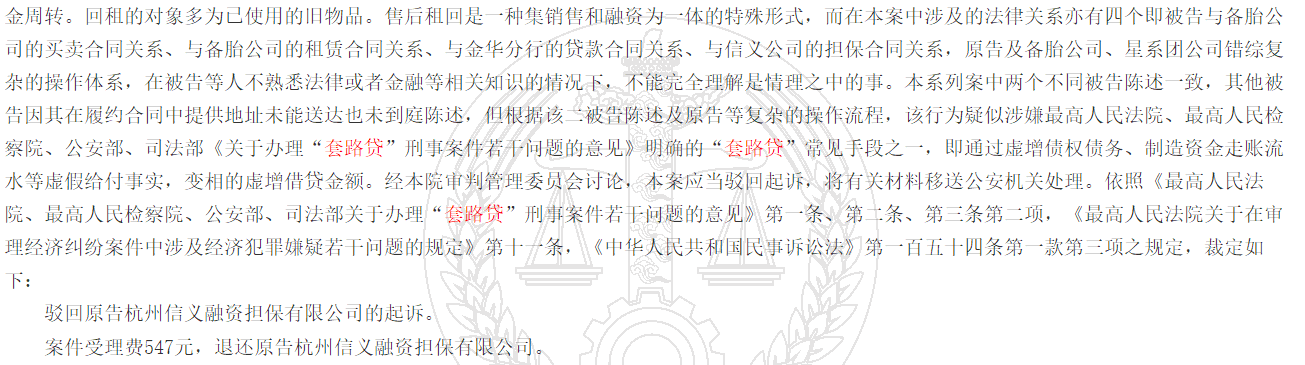 法院认为在以杭州信义为原告,其他众多当事人为被告的一系列追偿权纠纷案件中,涉及的法律关系有四个即被告与备胎公司的买卖合同关系、与备胎公司的租赁合同关系、与金华分行(指工商银行金华分行)的贷款合同关系、与信义公司的担保合同关系,原告及备胎公司、星系团公司错综复杂的操作体系,在被告等人不熟悉法律或者金融等相关知识的情况下,不能完全理解是情理之中的事。