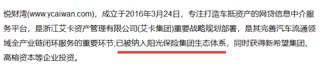 阳光人寿持有浙江艾卡28%股份,为最大单一大股东。在网上一则介绍浙江艾卡的文章中,浙江艾卡推出的车抵资产的网贷信息中介服务平台悦财湾“已被纳入阳光保险集团生态体系”。