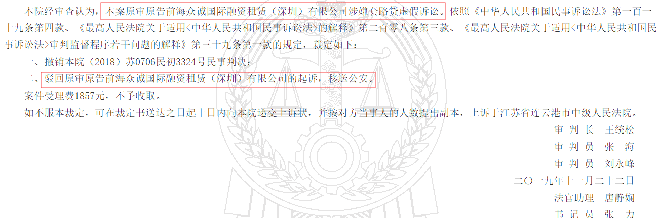 连云港市海州区人民法院审查认为,众诚国际涉嫌套路贷虚假诉讼,驳回众诚国际的起诉,移送公安。