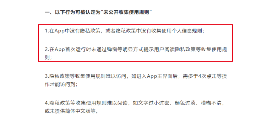 本次《公告》明确表示,若App中没有隐私政策,或者隐私政策中没有收集使用个人信息规则,以及在App首次运行时未通过弹窗等明显方式提示用户阅读隐私政策等收集使用规则,这种行为将被定性为“未公开收集使用规则”。属于违规违法收集使用用户个人信息的表现之一。