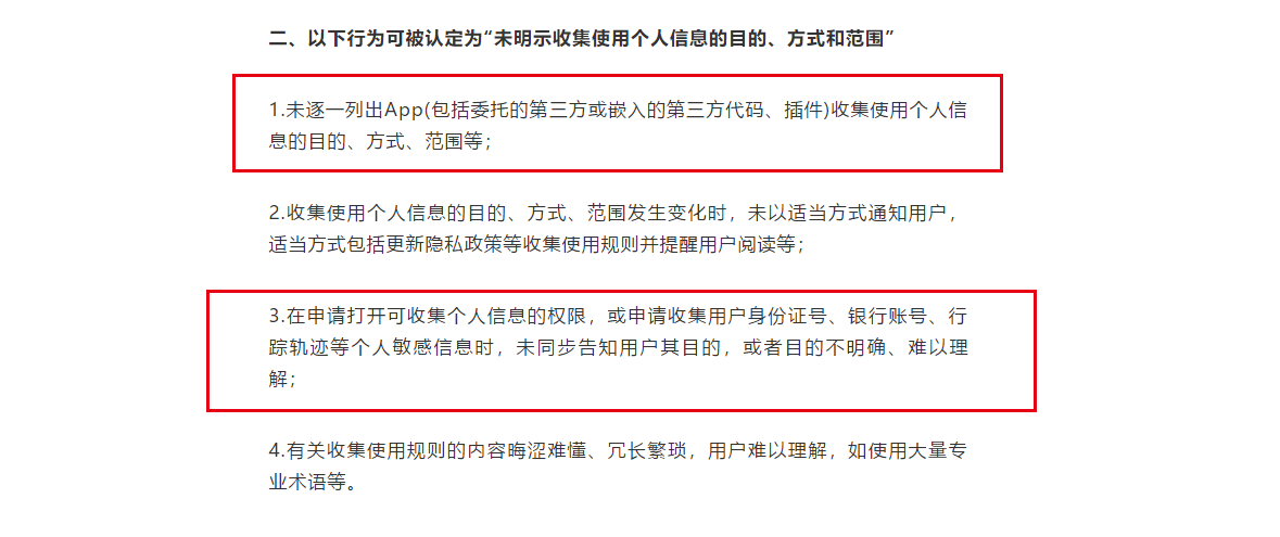 对于APP在收集用户数据时,未逐一列出App收集使用个人信息的目的、方式、范围,以及在申请收集用户身份证号、银行账号、行踪轨迹等个人敏感信息时,没有同步告知用户收集此类信息的目的等行为,在《公告中》被定性为“未明示收集使用个人信息的目的、方式和范围”,也属于违规行为。