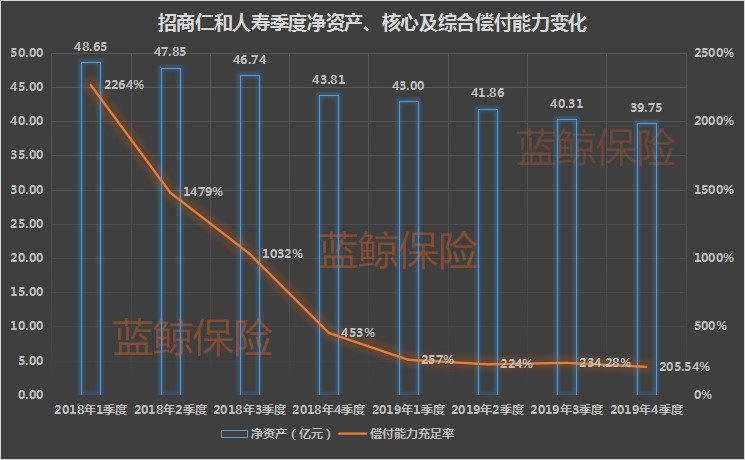 而也正是伴随业务逐渐深化开展,近两年,招商仁和人寿的季度核心、综合偿付能力不断下滑,2018年1季度,核心、综合偿付能力综合率高达1479%,2019年4季度降至205.54%。同时,净资产也在不断缩水,从2018年1季度的48.65亿元缩减至2019年4季度的39.75亿元。此次增资,对于招商仁和人寿资本实力与偿付能力充足率将有明显提升作用。