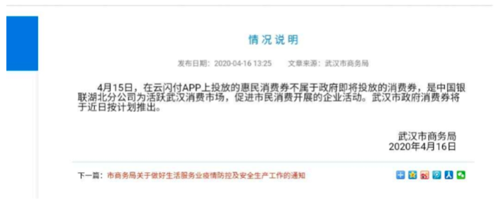 4月16日,武汉市商务局官网发布情况说明表示,4月15日,在云闪付APP上投放的惠民消费券不属于政府即将投放的消费券,是中国银联湖北分公司为活跃武汉消费市场,促进市民消费开展的企业活动。武汉市政府消费券将于近日按计划推出。