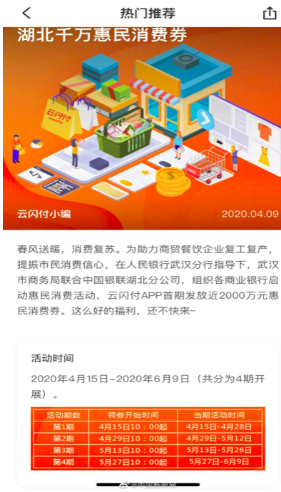 此前,云闪付APP开展湖北千万惠民消费券活动,称为助力商贸餐饮企业复工复产,提振市民消费信心,在人民银行武汉分行指导下,武汉市商务局联合中国银联湖北分公司组织各商业银行启动惠民消费活动,云闪付APP首期发放近2000万元惠民消费券。
