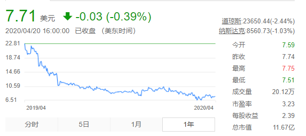 先看一下股价,截至 4月 21 日下午,360 金融股价为每股7.59美元,每股在一年内下跌了13.37美元。当前,360金融的总市值为11.67亿美元,较一年前上市时已跌去一半不止。