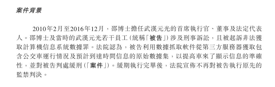 招股书显示,据当时判决书,2015年11月至2016年5月,时任元光公司法定代表人邵凌霜和技术总监陈昴为了提高元光公司开发的智能公交APP“车来了”在中国市场的用户量及信息查询的准确度,保证公司更好的经营,由邵凌霜授意陈昴,指使公司员工刘江红、刘坤朋、张翔利用网络爬虫软件获取谷米公司服务器中的实时数据,日均300万至400万条。