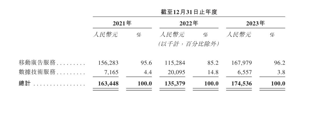 在业务构成中,移动广告收入分别为1.56亿、1.15亿及1.68亿元,分别占各年度总收入的95.6%、85.2%及96.2%。