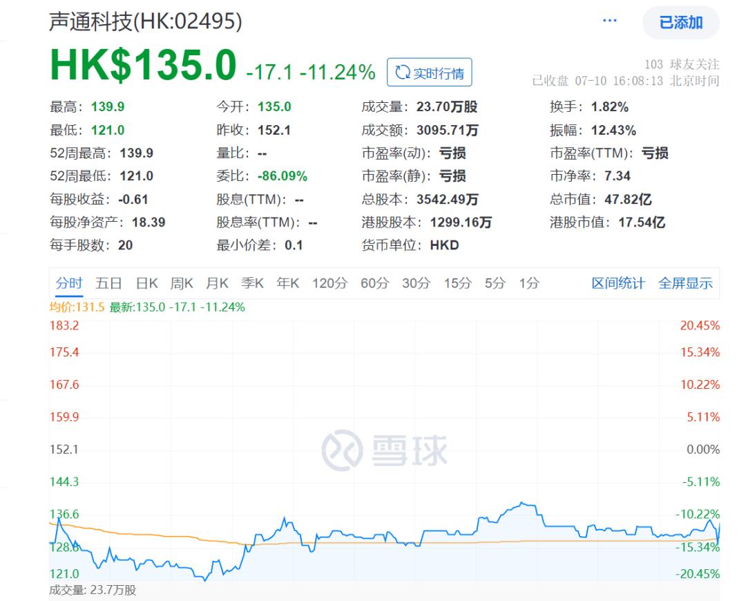 7月10日,企业级AI交互服务商声通科技正式登陆港股市场。上市首日,声通科技开盘价为135港元/股,跌破发行价,截至当日收盘,声通科技收报135港元/股,市值为47.82亿港元。
