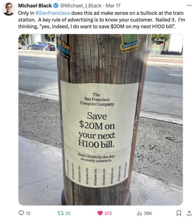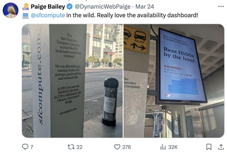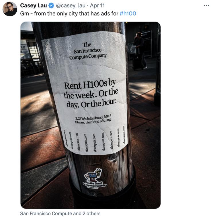 作为全世界生成式人工智能的火热据点,旧金山街道遍布的各类AI广告早已成为它的“城市特色”。可即便如此, 这个“出租算力”的概念仍然很酷,而且是把高高在上的英伟达H100变得如此接地气,在AI圈内引起了一阵小波澜。