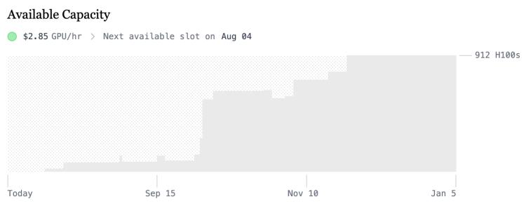 根据SF Compute官网信息(下图):当前 GPU 使用价格为2.85 美元/小时,下一个可用时间段是 8 月 4 日。从现在到明年1月5日的可用容量在逐步增加,到年底达到912个H100 GPU。