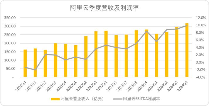 同时,在利润侧,直到2023年以前,阿里云的EBITDA利润率挣扎在低个位数的盈亏平衡线上,但2024年增长明显,Q4更是接近了两位数的区间。