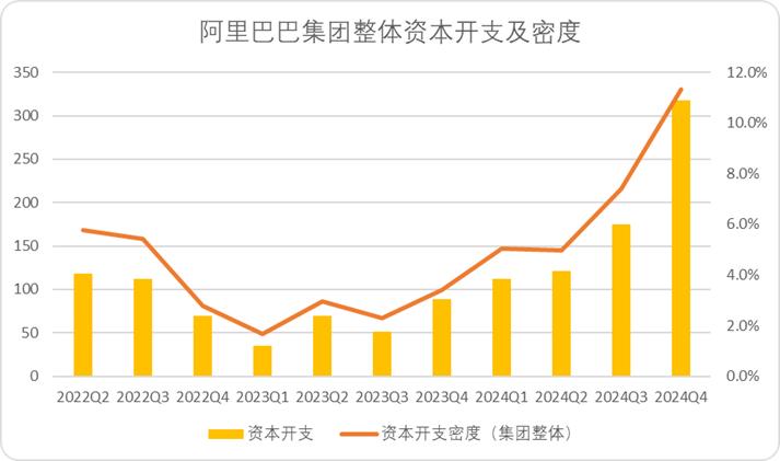 阿里巴巴同样也是这一轮资本开支周期的旗手,从2023Q3的低点以来,资本开支连续六个季度环比增长,并且资本开支密度大幅度增强。根据第四季度的测算,阿里资本开支已经占当季营收的11.3%左右,属于相对较高的水平。