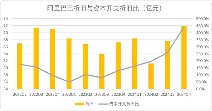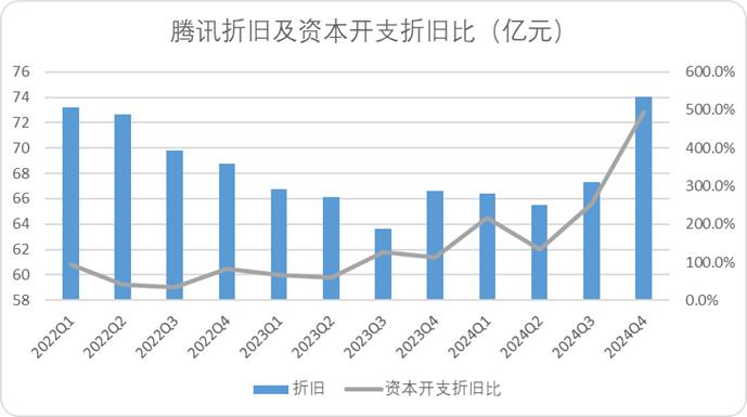 同时,虽然业绩会中腾讯的高管花了大量的篇幅来安抚投资者资本开支并不会大幅度抬升折旧费用,但从实际的表现来看,还是2024Q4折旧率的提升还是非常明显。