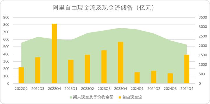 就在年报期,阿里公布了资本开支的计划,也与去年四季度资本开支的动向契合,未来三年将投入3800亿用于AI和基础设施建设,过去三年阿里自由现金累计3819亿。