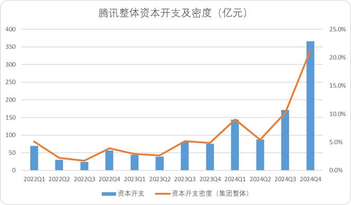 但反应过来的腾讯加大了投资力度,正如刘炽平业绩会的表述,四季度腾讯整体的资本开支绝对称得上中概互联的龙头,并且以资本开支密度来看,2024年Q4腾讯的资本开支密度达到了惊人的21.2%