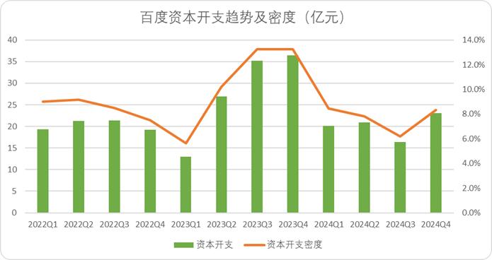 并且,百度资本开支意愿也不是很强。自2023Q4以来,百度的资本开支密度出现了明显的下滑,资本开支的强度基本上取决于营收的薄寡,没有主动的资本开支行为。