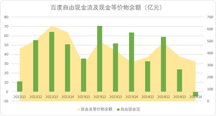 相较于腾讯阿里,百度的资本实力也不够雄厚,过去三年累计自由现金流大约为513亿左右,四季度资本开支稍抬一点头,自由现金流便由正转负。
