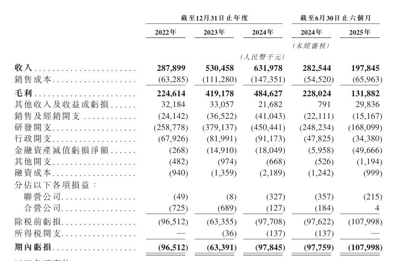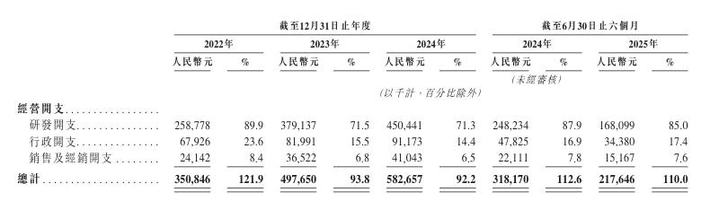 招股书显示,2022年至2024年,该公司的研发开支持续攀升,分别为2.59亿元、3.79亿元和4.50亿元,占总营收的90%、72%、71%和85%。2025年上半年,研发开支进一步达到1.68亿元,占同期营收的85%。