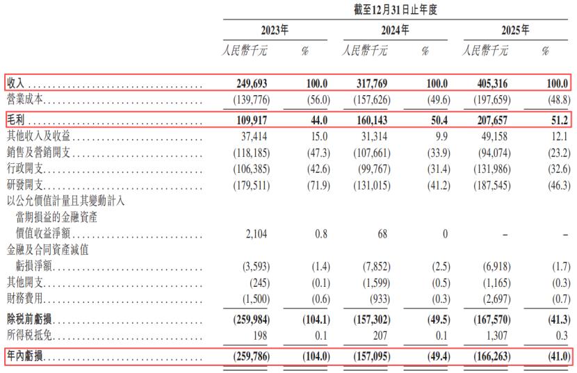 2023年、2024年及2025年(报告期),公司分别实现收入2.5亿元、3.18亿元、4.05亿元,毛利率分别为44.0%、50.4%及51.2%。