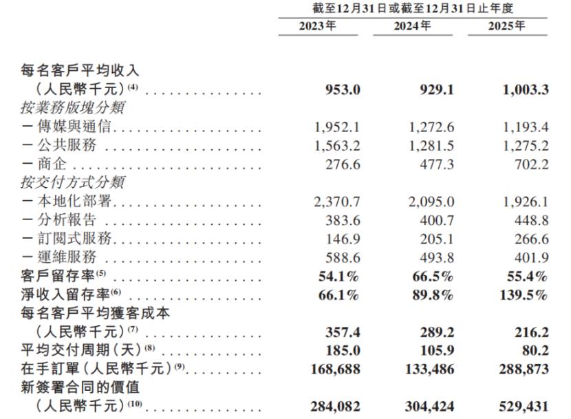 值得注意的是,过去几年,在传媒与通信行业、公共服务这两个行业,中科闻歌的客单价有所下降;2025年,这两部分业务的客单价分别为119.34万元、127.52万元,较2023年的客单价分别下降了38.87%、18.42%。