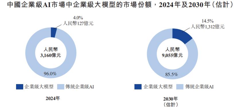根据灼识咨询的资料,2024年中国企业级人工智能市场规模已达3160亿元,预期至2030年将突破人民币9000亿元,复合年增长率为19.2%。