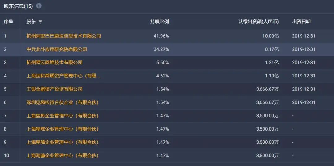 股权穿透显示,截至目前, 杭州阿里巴巴蔚投信息技术有限公司(简称,阿里蔚投)为千寻位置第一大股东,持股比例为41.96%;中兵北斗应用研究院为第二大股东,持股比例34.27%;第三大股东是杭州骋云网络技术有限公司(简称,骋云网络),持股比例为5.50%。