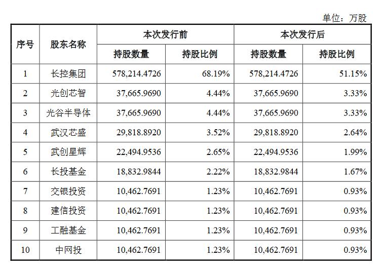 IPO前,长控集团持股为68.19%,光创芯智、光谷半导体分别持股为4.44%,武汉芯盛持股为3.52%,武创星辉持股为2.65%,长投基金持股为2.22%,交银投资、建信投资、工融基金、中网投分别持股为1.23%,农银投资持股为0.93%。