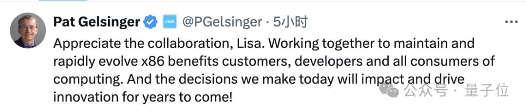 AMD CEO苏姿丰(Lisa Su)和Intel CEO格尔辛格(Patrick Gelsinger)同时官宣,两家共同发起了“x86咨询小组”。