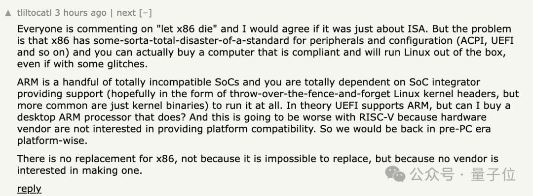 如果人们说的“让x86消亡”指的是ISA,那么我非常同意。但问题在于, x86对于外围设备和配置(ACPI、UEFI 等)有一些“完全灾难性的”标准。所以,x86没有替代品,不是因为它(本身)不可替代,而是因为没人想要打破它。