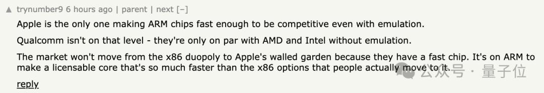 何况ARM还存在性能的不足,有人指出,除了苹果,其他厂商的ARM芯片在原生性能上,都不如x86。