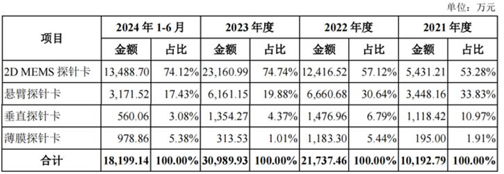 报告期内,按产品类别分类,2D MEMS探针卡是公司的主要营收来源。2024年1-6月,2D MEMS探针卡的销售收入占比达到74.12%,悬臂探针卡、垂直探针卡、薄膜探针卡的营收占比分别为17.43%、3.08%和5.38%。