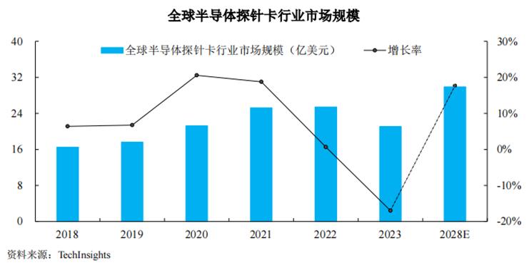但随着半导体产业的景气度回升以及晶圆测试重要性的增加,Tech Insights预测2028年全球半导体探针卡行业市场规模将增长至29.90亿美元。