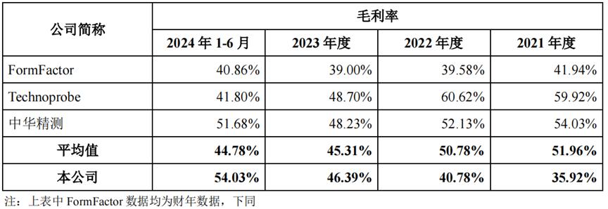 受探针卡国产替代进程加速、毛利率较高的MEMS探针卡收入占比提高等因素影响,报告期内,公司毛利率分别为35.92%、40.78%、46.39%和54.03%。