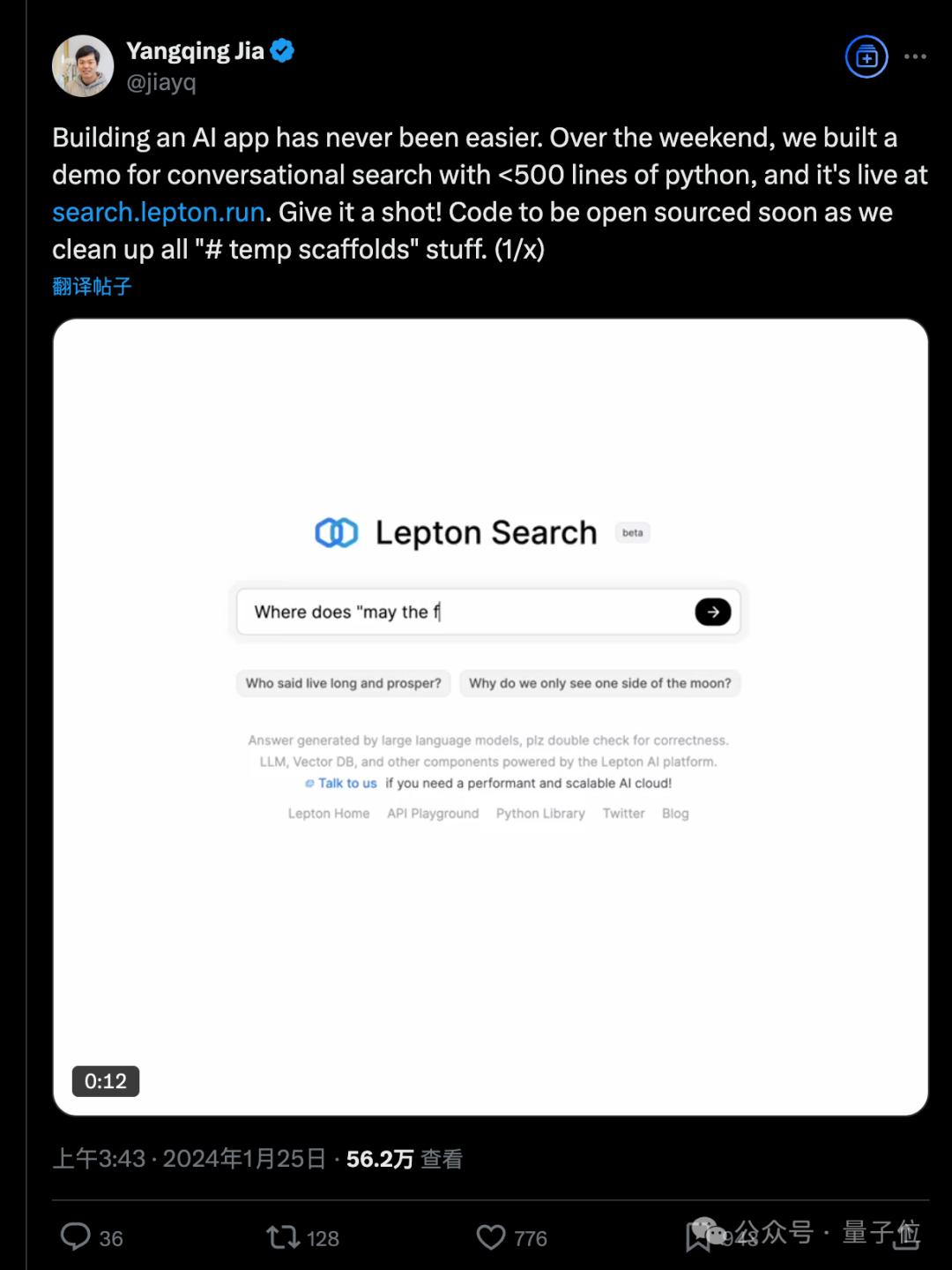 在开源方面,LeptonAI曾因只用500行代码就实现对话式搜索引擎的演示而闻名。