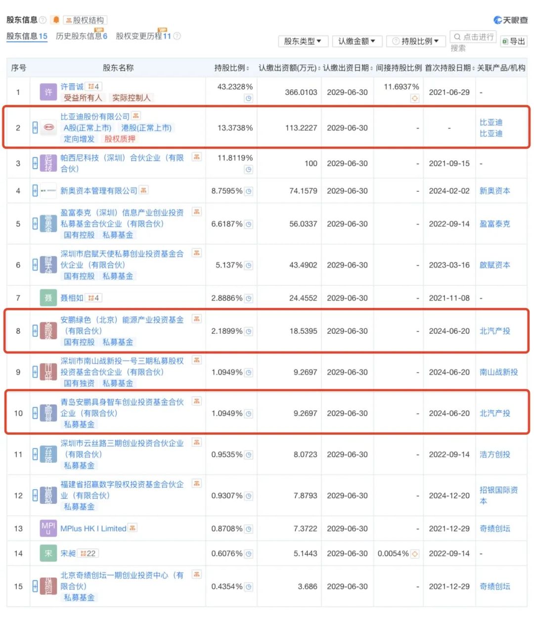 天眼查App信息显示,目前,比亚迪持有帕西尼13.3738%股份,系第一大外部股东。由此可见,比亚迪对于帕西尼的看好。此外,北汽产投合计持有帕西尼3.2848%股份。
