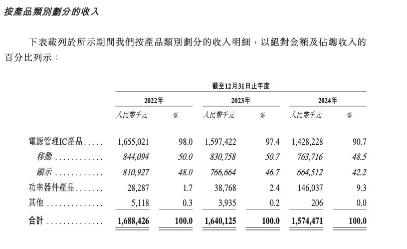其中,电源管理IC产品为主要收入来源,报告期内其收入分别为16.55亿元、15.97亿元、14.28亿元,占比超过了90%。